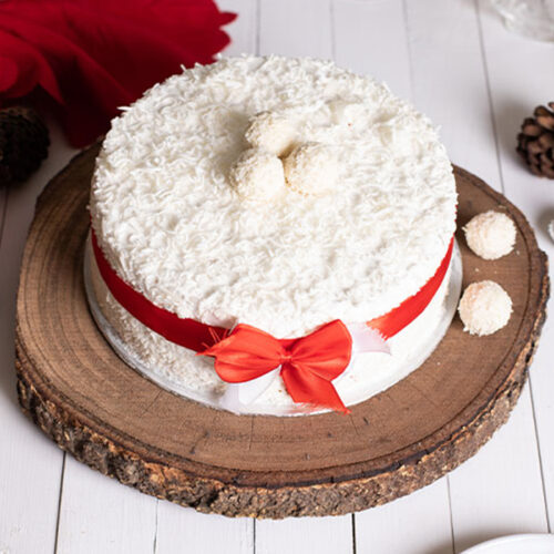 Our Rafello Cake is a luxurious delight crafted for those who cherish sophistication in every bite. Layers of soft, moist sponge are infused with a creamy coconut filling, topped with a luscious white chocolate ganache. Finished with delicate flakes of coconut and a sprinkle of almond crumble, this cake is a symphony of textures and flavors.